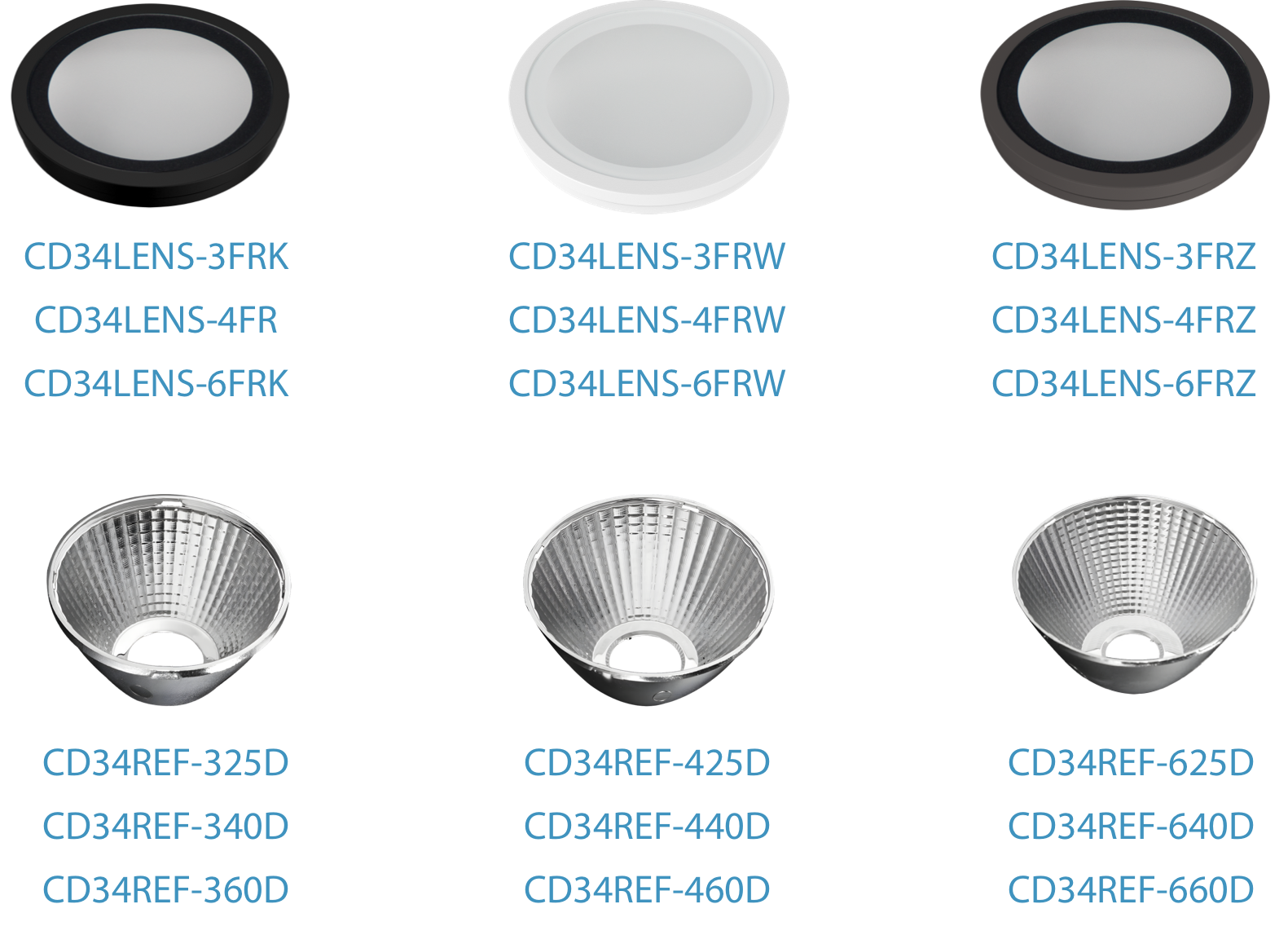 *3" models come standard with 25° optics, 4" come with 40°, and 6" come with 60°. Accessories are available for all sizes in all three distributions.