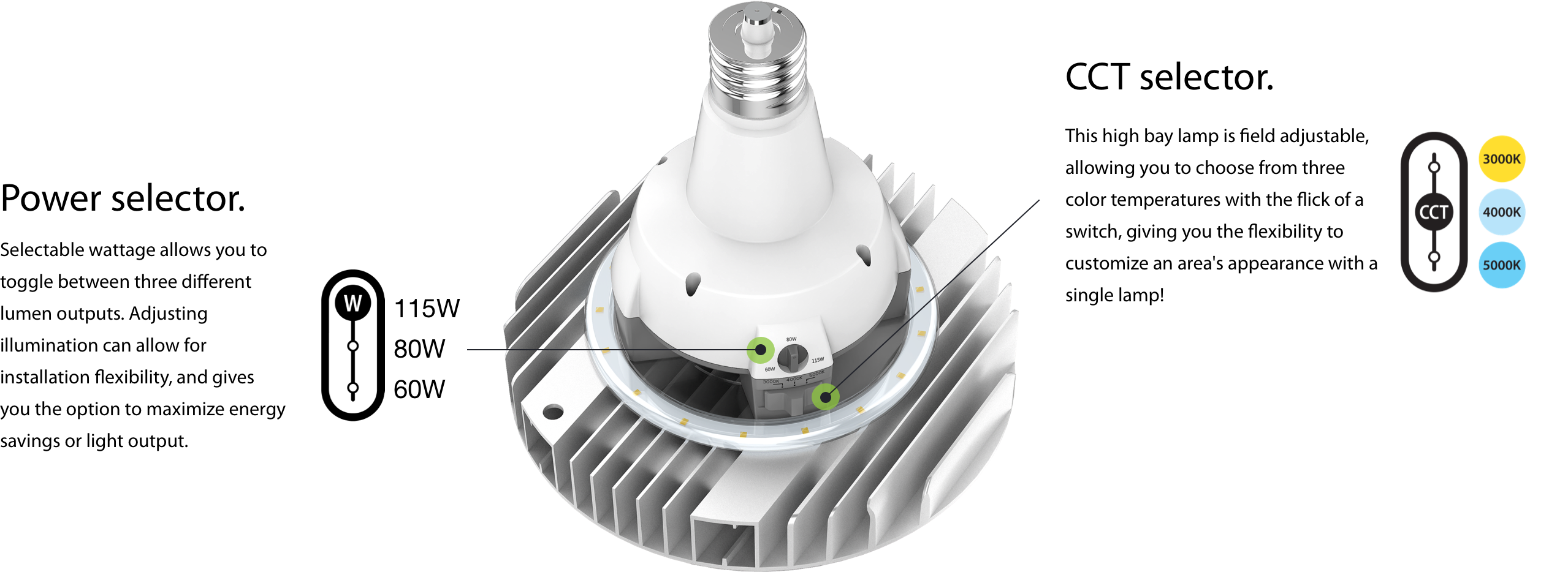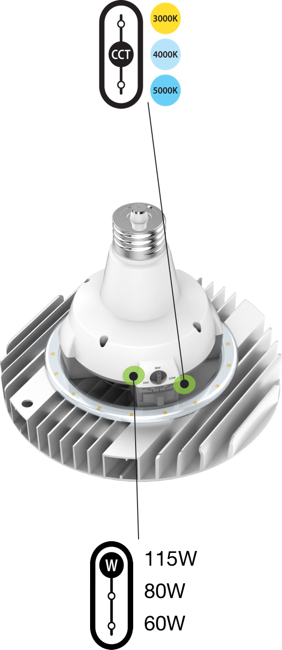 This high bay lamp is field adjustable, allowing you to choose from three color temperatures with the flick of a switch, giving you the flexibility to customize an area's appearance with a single lamp!