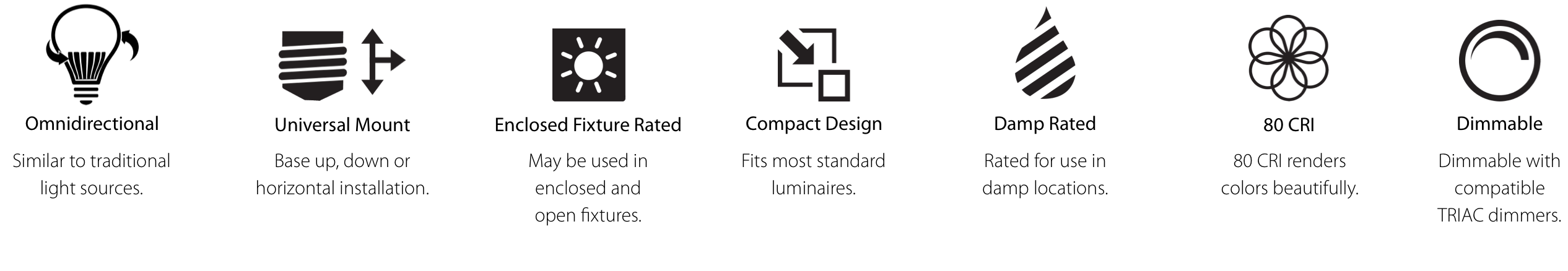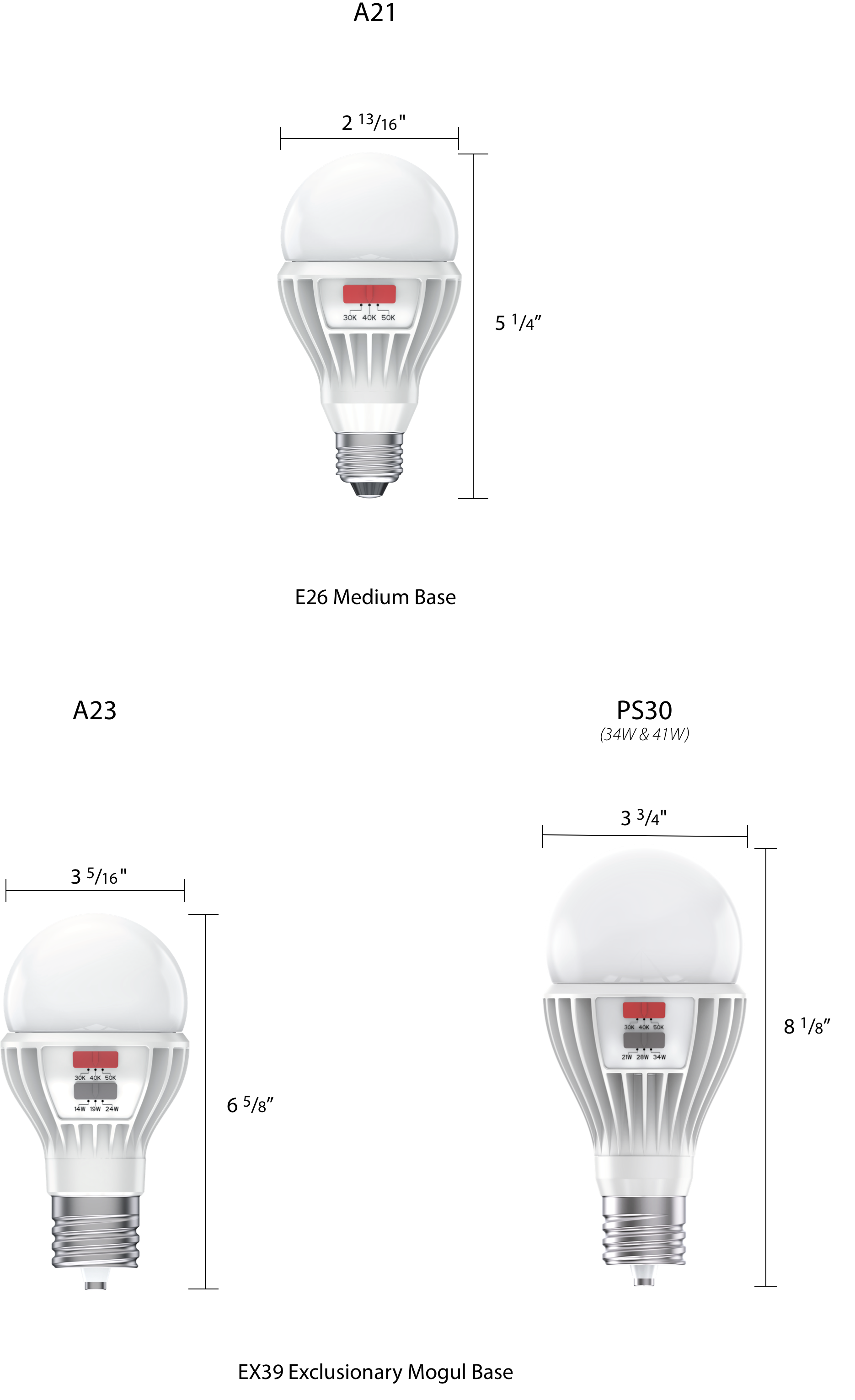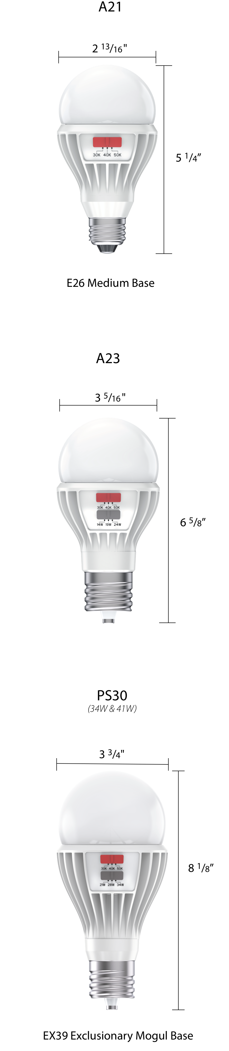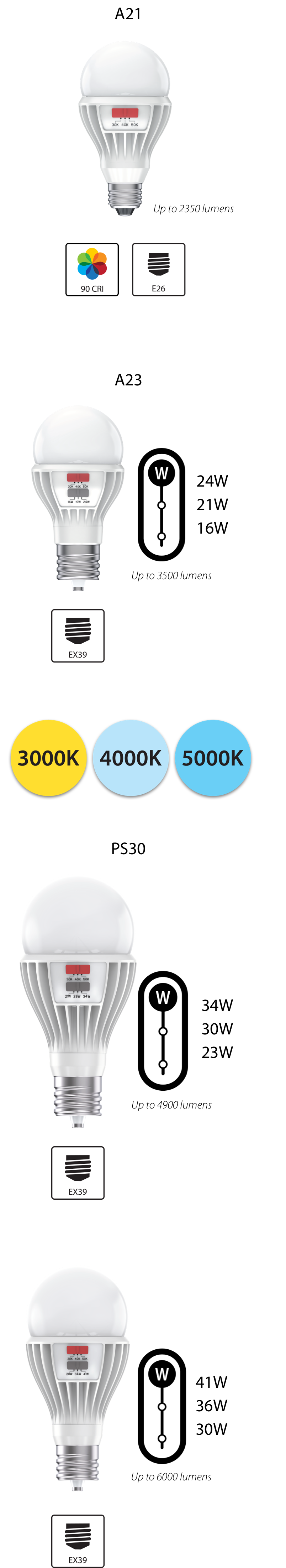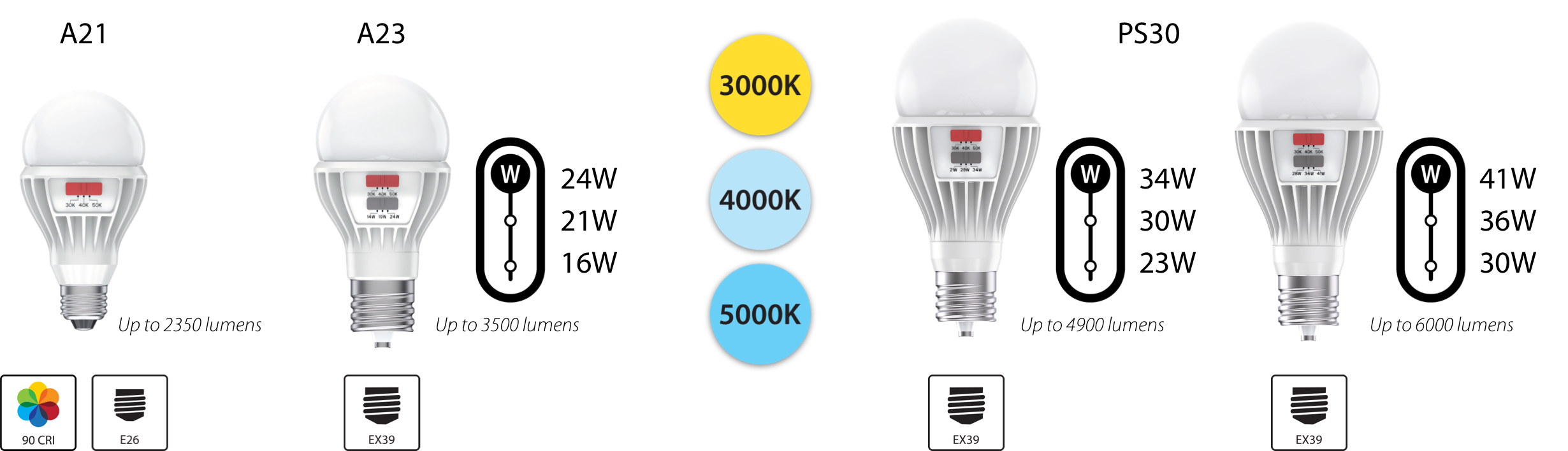 All commercial bulb models boast 3 field-adjustable color temperatures, and the A23 and PS30 designs also include 3 field-adjustable wattages for complete on-site customization.