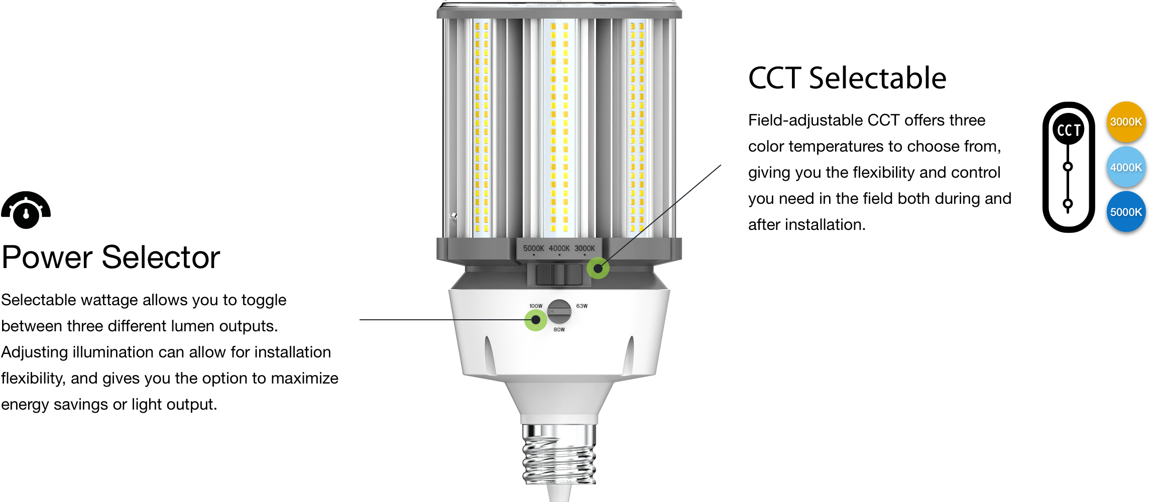 Field-adjustable CCT offers three color temperatures to choose from, giving you the flexibility and control you need in the field both during and after installation.