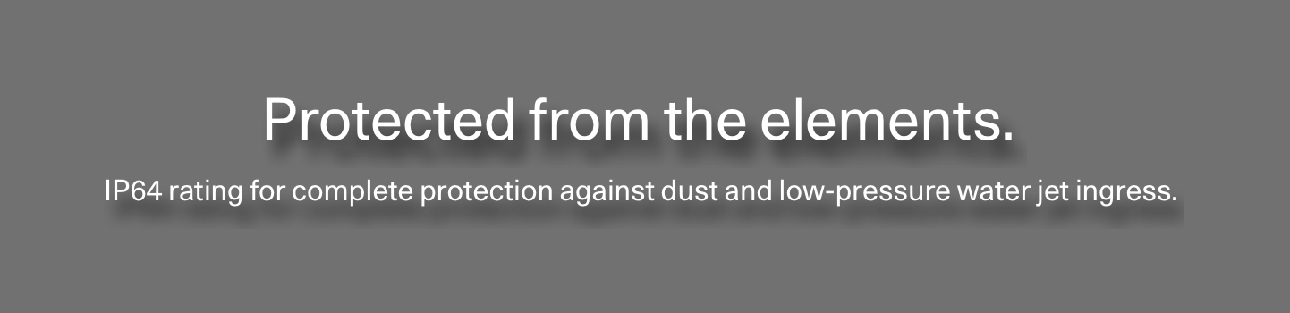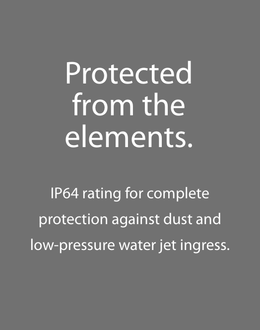 IP64 rating for complete protection against dust and low-pressure water jet ingress.