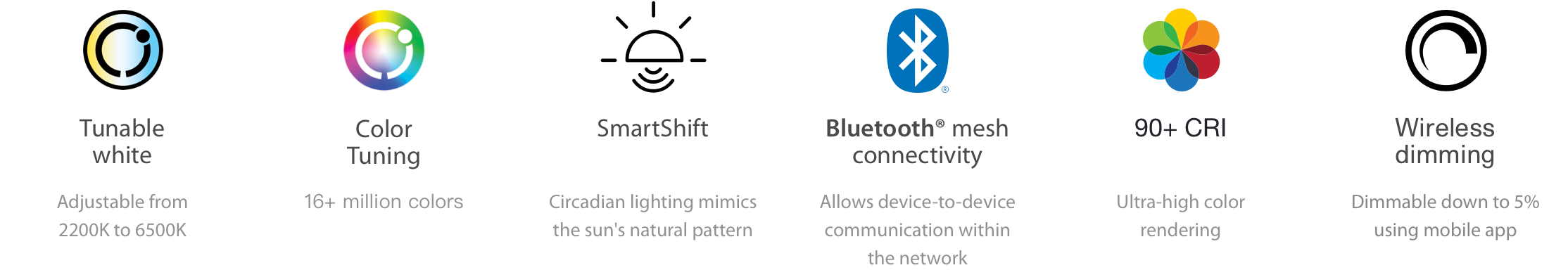 • Direct Connect: Use the Lightcloud Blue mobile app to connect to your lamps in minutes via Bluetooth Mesh; no Gateway or Hub required.