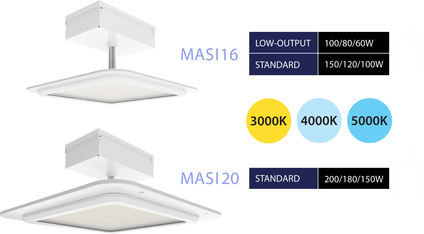The reimagined MASI delivers powerful, uniform illumination in a sleek design that blends seamlessly into any canopy soffit. With two sizes that boast field-adjustable wattage and CCT, you can fine-tune the output on site to match the unique needs of the application with just a single SKU.