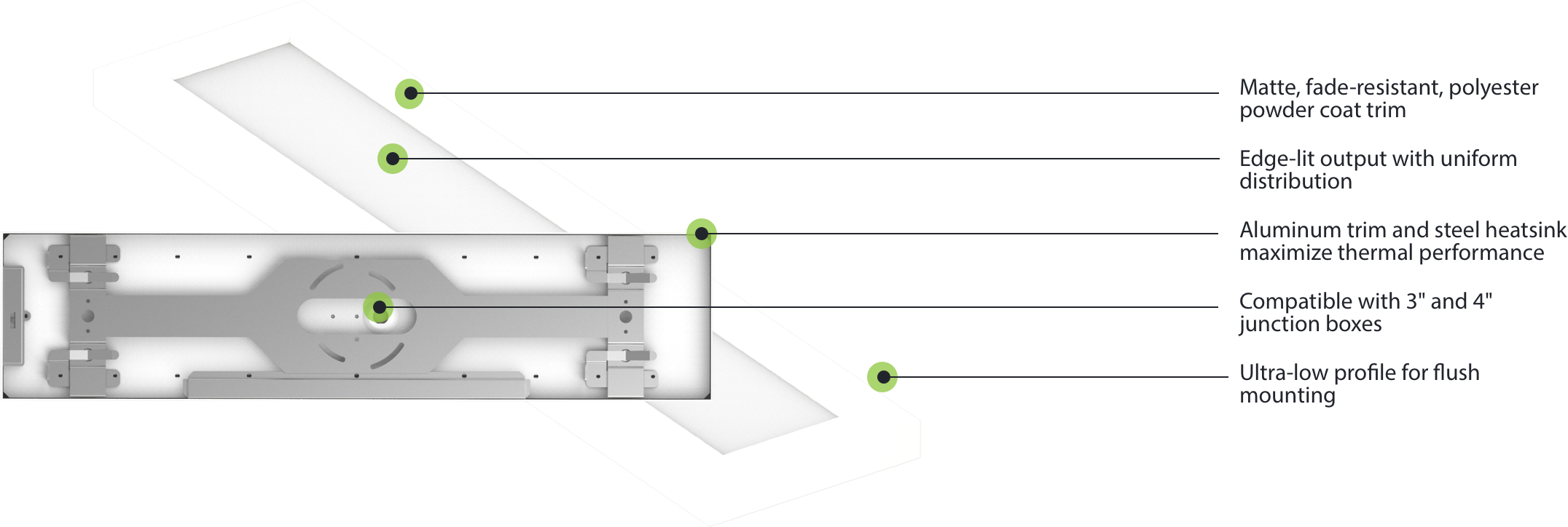 The surface linear uses edge-lit technology to disperse light through a diffusion lens which creates a smooth, uniform distribution and reduces glare. All models are dimmable with TRIAC systems and 90 CRI for more accurate color rendering.