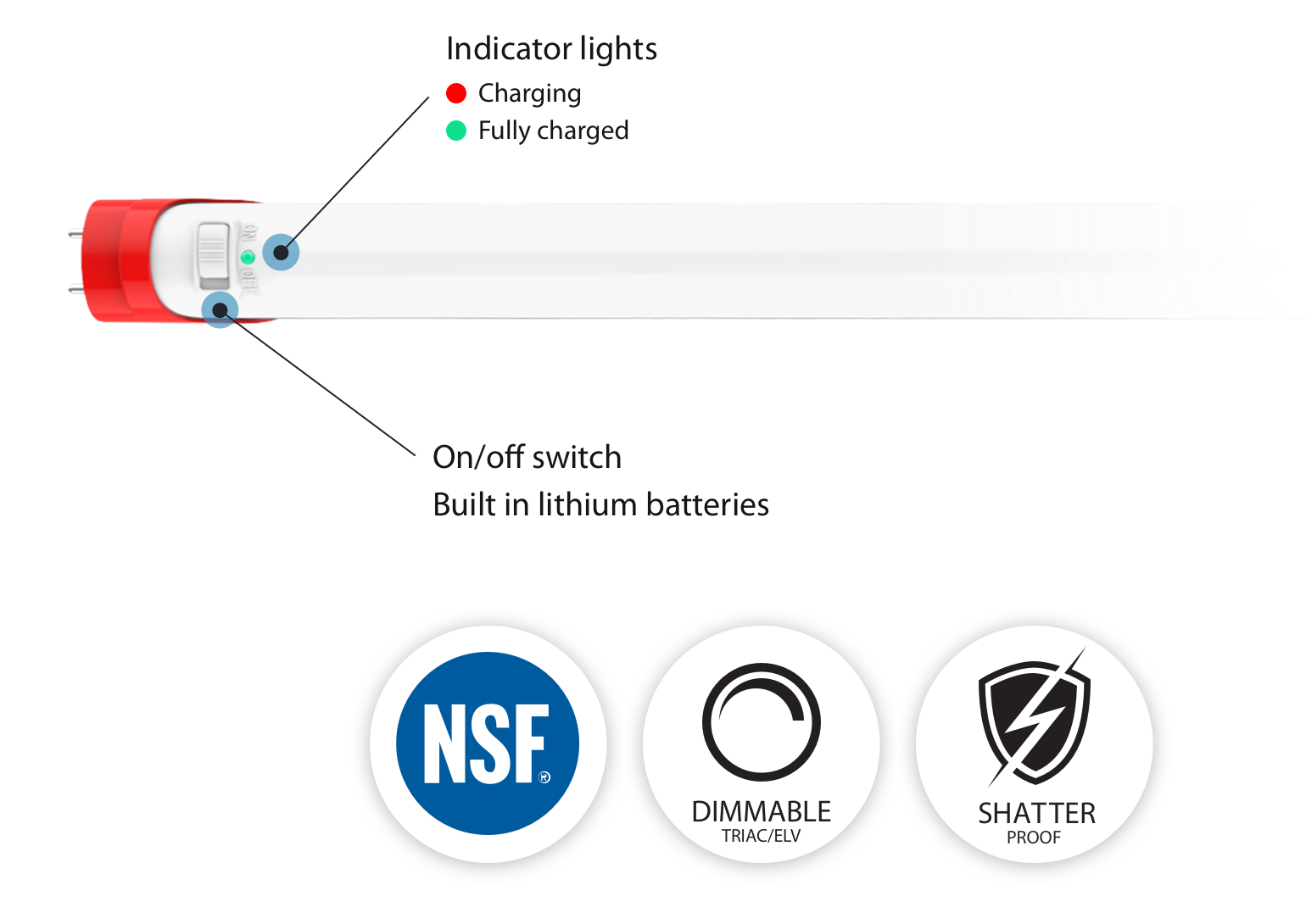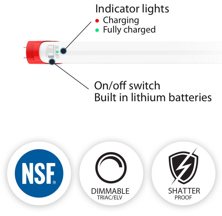RAB's T10EM tube is designed and engineered as an all-in-one, general purpose lighting and battery-powered backup LED solution. The tube can be switched on as a normal lamp, providing high lumen efficacy and supporting on/off switching operation. The integrated batteries provide a minimum of 90 minutes of light.