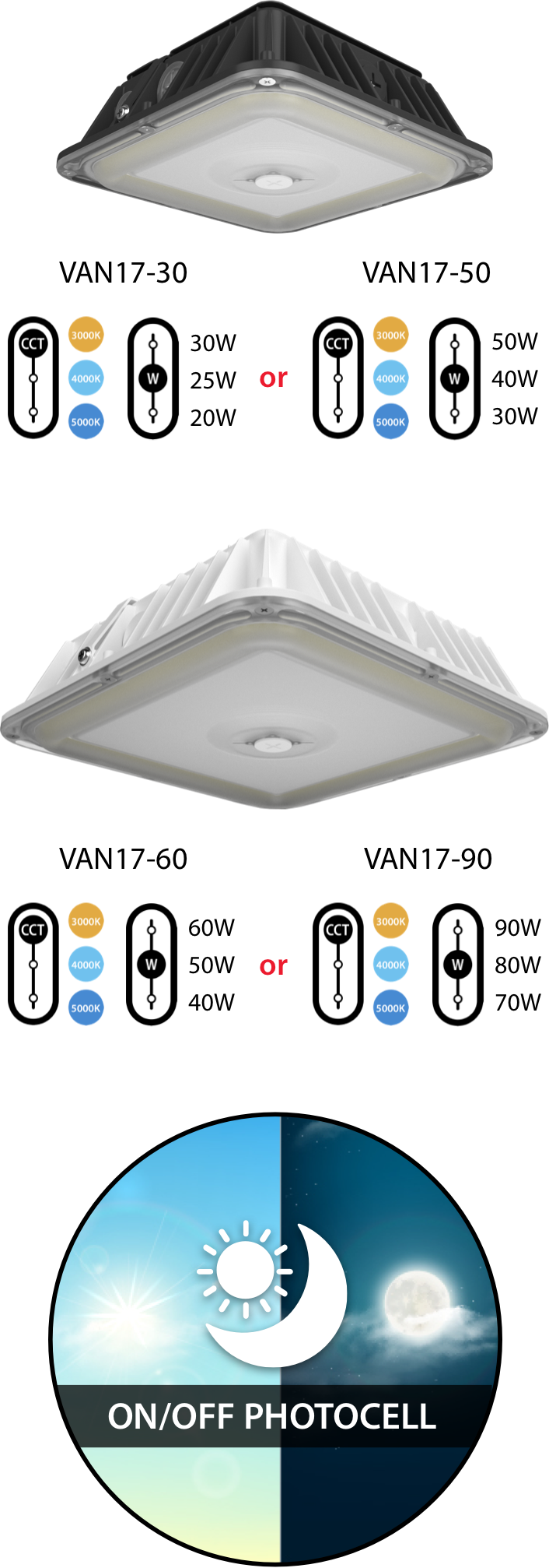 With adjustable wattage, adjustable CCT, and an on/off photocell, the VAN17 drastically reduces SKU count while maximizing flexibility in the field. Models are available in bronze and white, and in two sizes which cover the footprint of most old HID canopy lighting.