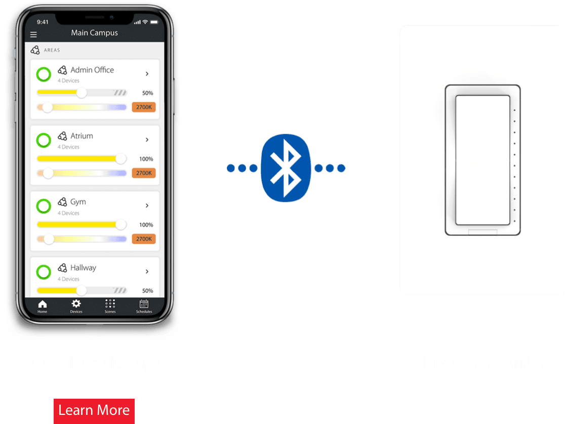 The XDIM Bridge easily connects your Lightcloud Blue area to a Lightcloud Gateway, gaining you access to a complete suite of premium features including remote access, BACnet integration, demand response, and user permissions.