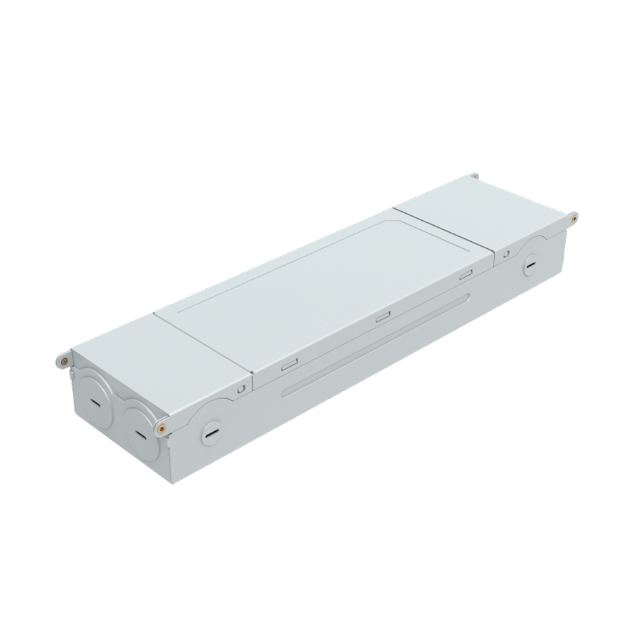 Die formed metal driver / junction box with captive hinged junction box cover. Listed for Maximum of (4) 12AWG through branch circuit conductor suitable for 90°C permitted in box. Easy to wire in 2in/2out (plus ground) applications. (4) conduit pry-outs. (3) quick snap-in connectors for quick and reliable line voltage connections. Integral mounting facilitates direct mounting to building structure or mounting frame.