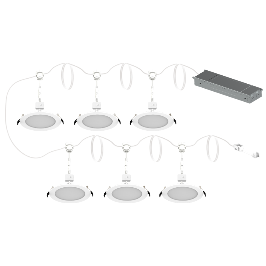 Daisy chain wafer is available as a kit that includes a single driver and six wafers, with the ability to add additional Daisy wafers. Available in 4" and 6" sizes with a smooth or baffle trim and 120-277V driver.