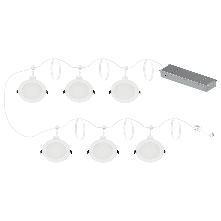 Daisy chain wafer is available as a kit that includes a single driver and six wafers, with the ability to add additional Daisy wafers. Available in 4" and 6" sizes with a smooth or baffle trim and TRIAC/ELV dimmable.
