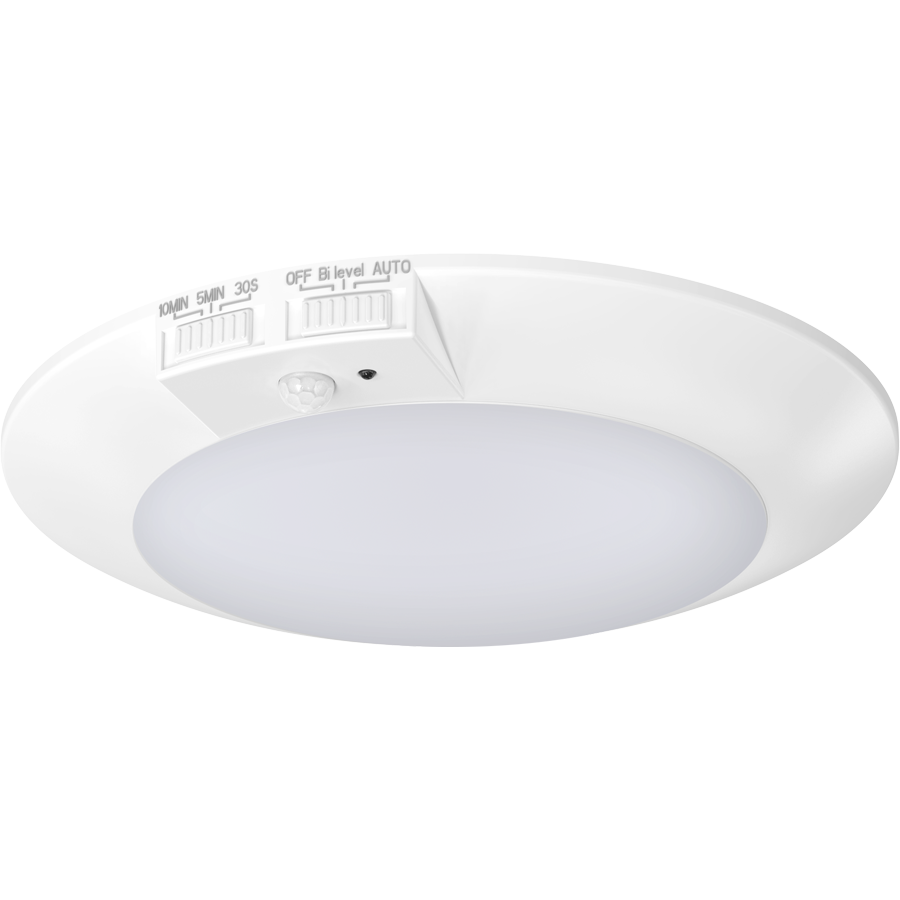 Low-profile surface mount with integrated motion sensor and photocell. Adjustable dip switches for color temperature, motion modes, and hold times.