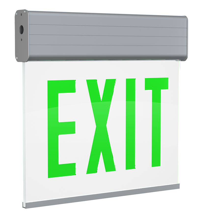 Edge-lit exit sign with a double face and green letters.