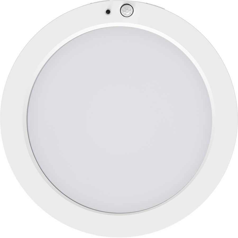 Contemporary round surface mount with integrated motion sensor and photocell. Adjustable dip switches for color temperature, motion modes, and hold times.