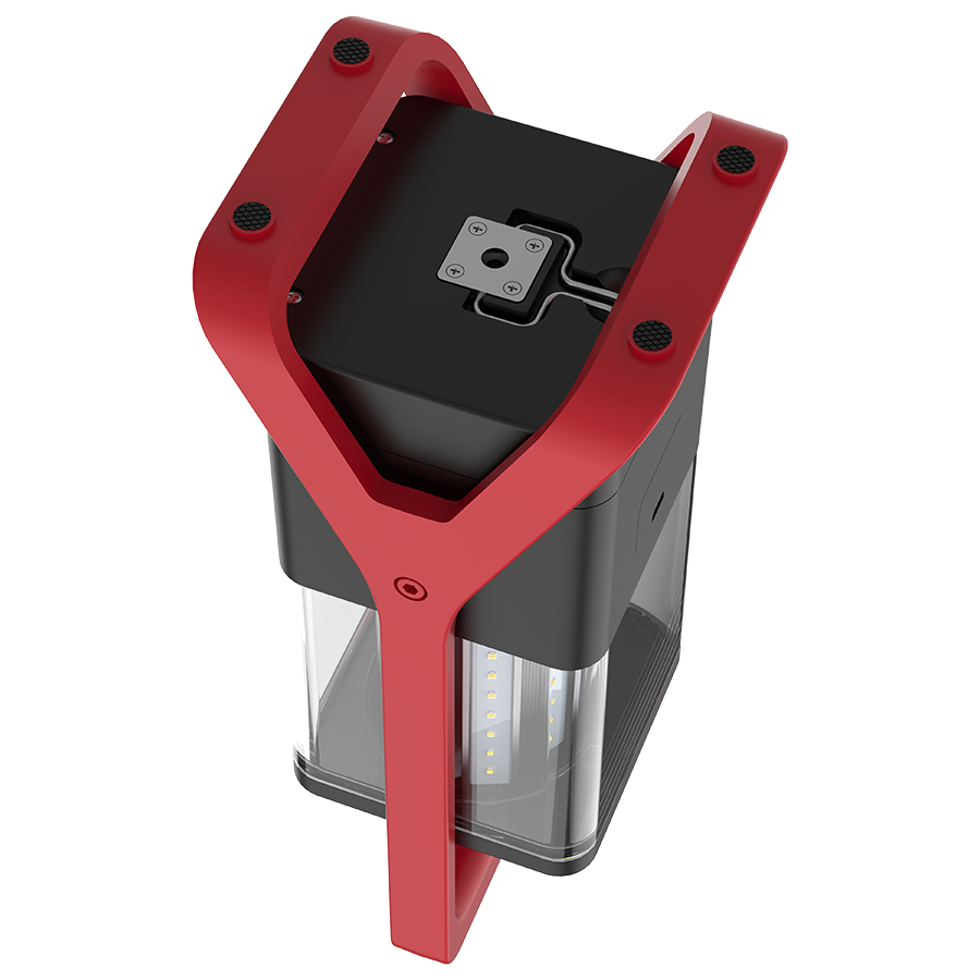 Integrated stand with carry handle. 1/2" Screw hole for tripod mounting. Retractable hook for hanging fixture.
