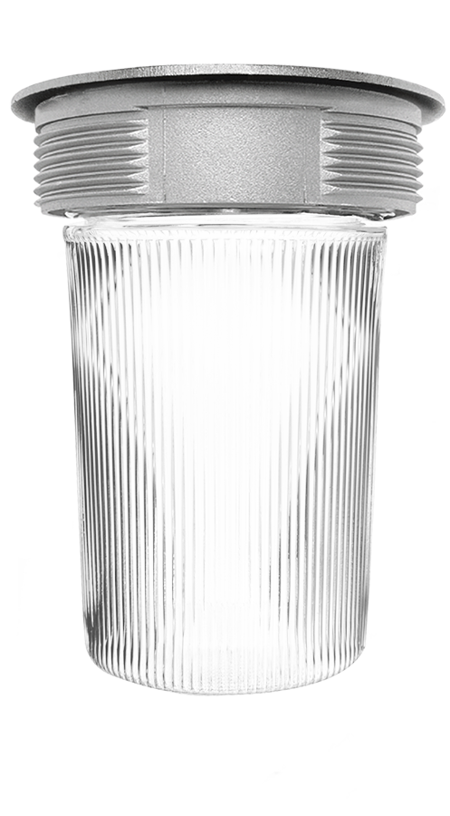 Supplied with clear flat bottom prismatic polycarbonate globe. Not for use with diecast or wire guard.
