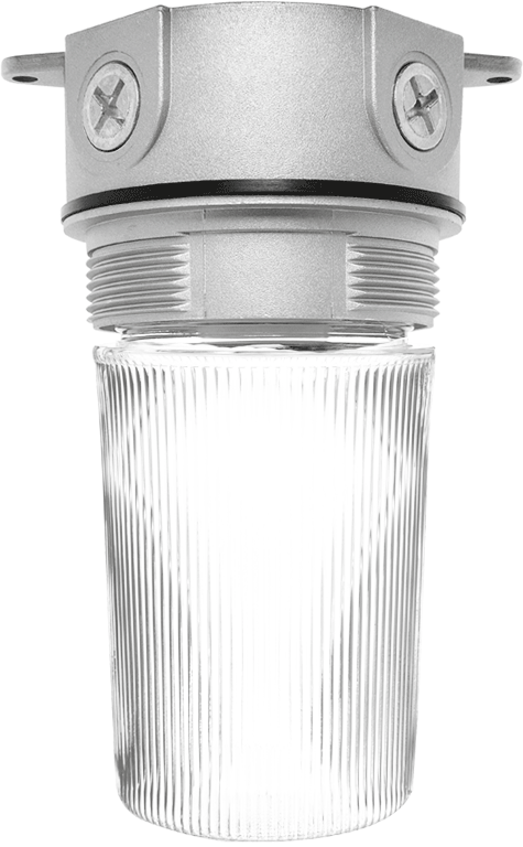 Supplied with clear flat bottom prismatic polycarbonate globe. Not for use with diecast or wire guard.