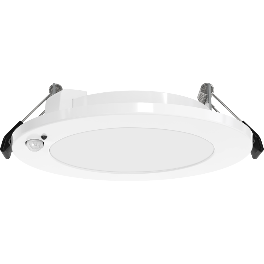 Direct mount downlights with adjustable dip switches for color temperature, motion modes, and hold times.