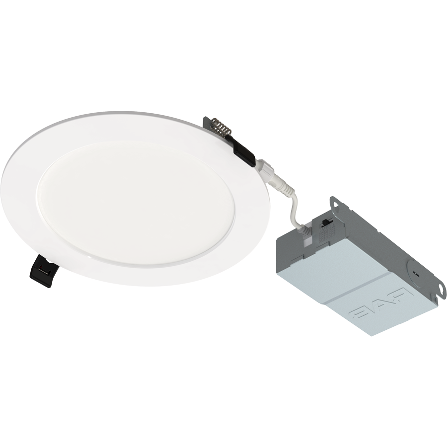 Bulk packaged contractor friendly, 4" and 6" wafers with selectable wattage and CCT that boast 90 CRI. Designed for 120V use and TRIAC/ELV dimming. Available with smooth or baffle trim
